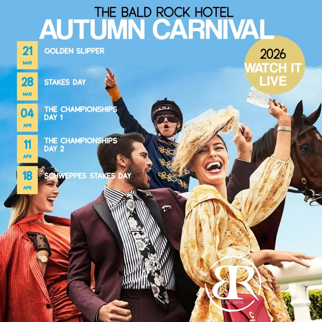 Watch the live racing here @ the Bald Rock Hotel this Autumn Racing Carnival with all your favourites… The Golden Slipper Stakes and The Championships!